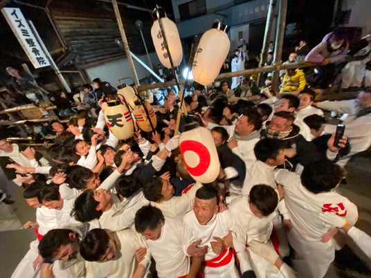 尾鷲ヤーヤ祭りは、2月1日から5日までの尾鷲神社の例祭で、戦国武将の名乗りに由来します。2日から4日の夜はたくさんの提灯が点る中、白装束を纏った男衆が、「チョウサじゃ!チョウサじゃ!」の掛け声とともに勇ましくぶつかり合います。旧町18町から集まった男衆の練りは熱気で溢れ返ります。