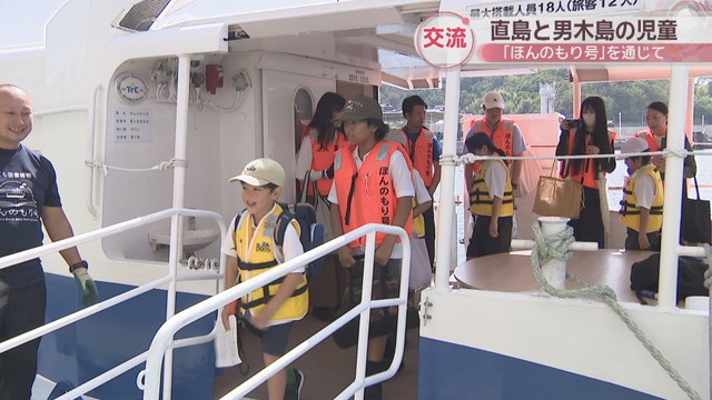 船から降りてきた男木小学校に通う児童5人を、直島小学校の5年生と6年生が出迎えました。