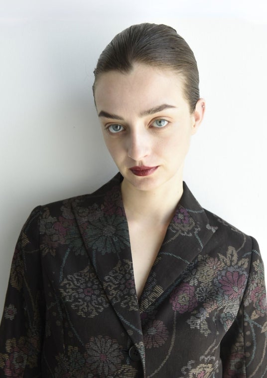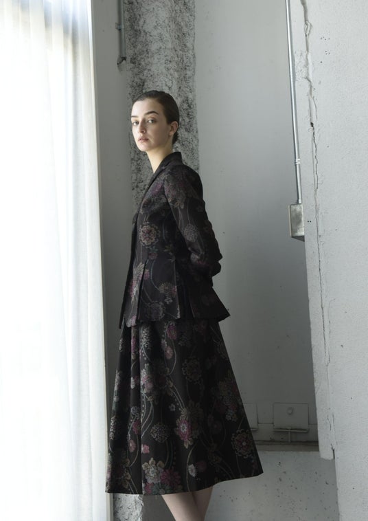 和柄の生地にレースをミックスし、ウエストをシェイプしたジャケット。(左)