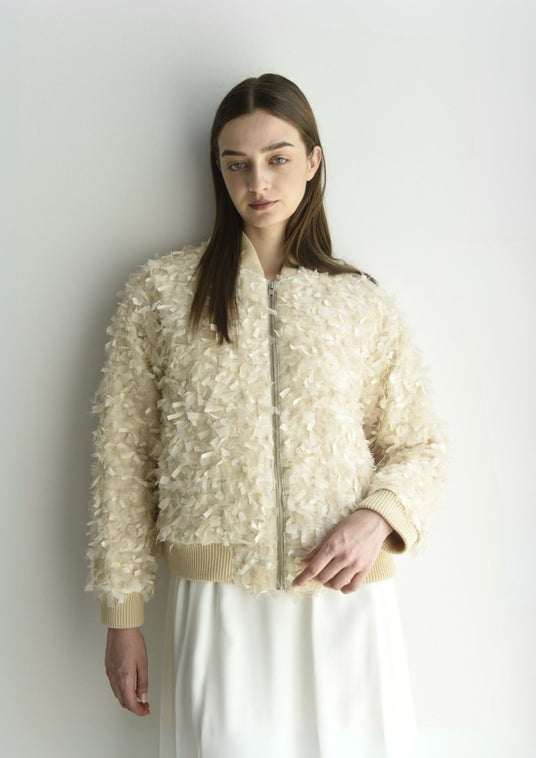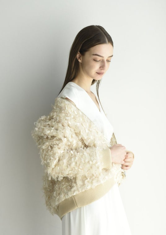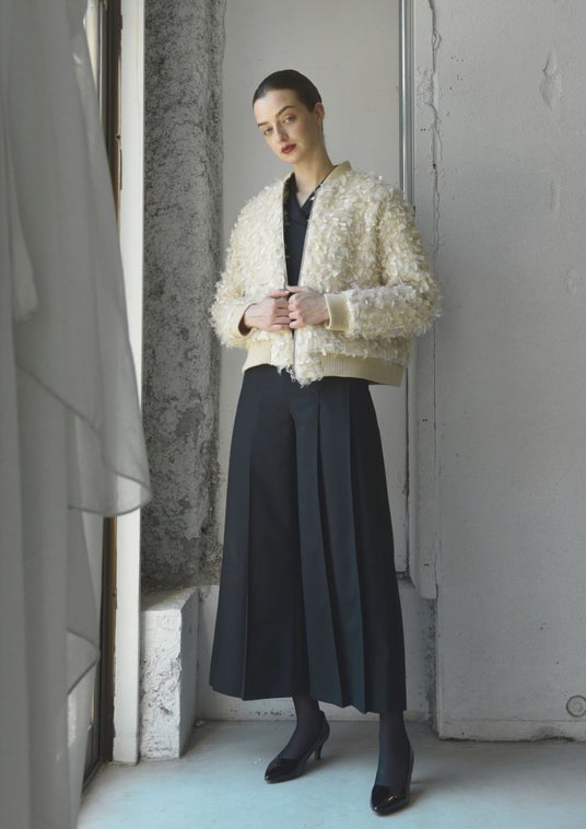 尾州の工場に特注したファンシーツイードを使用。複数の異素材を贅沢に織り交ぜた繊細で華やかなツイード生地を、MA-1スタイルにアレンジしたボンバージャケット。ドレスやスカートの上に羽織る他、カジュアル・マニッシュなパンツとあわせたコーディネートもおすすめです。
