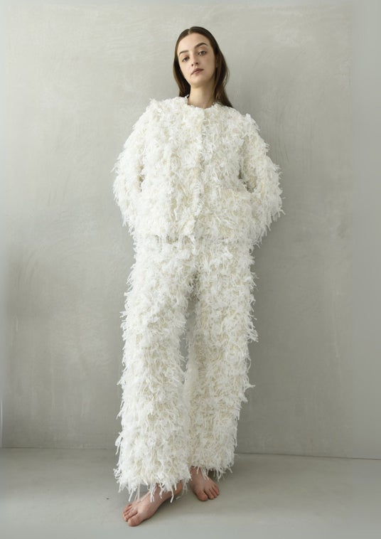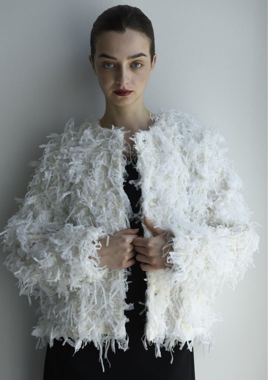 シャギー素材でボリュームあるノーカラーのツイードジャケット。(右)