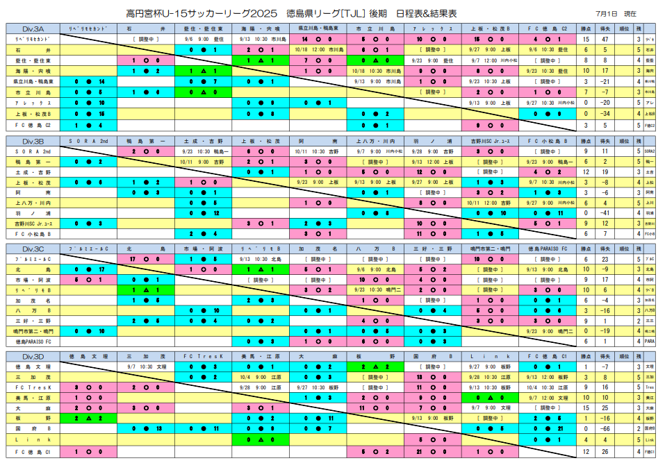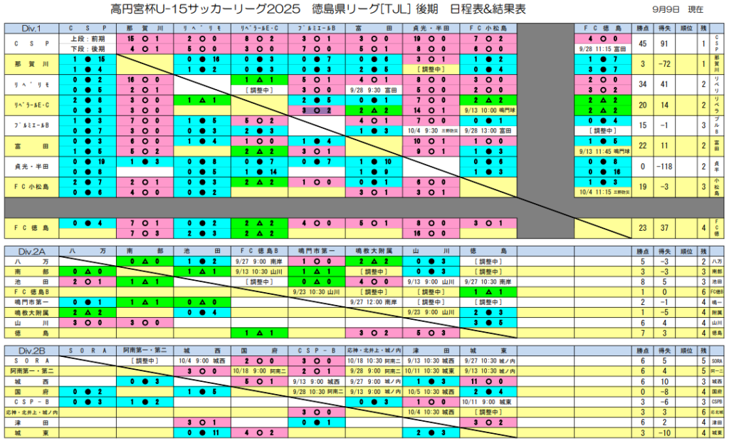 2024年度 高円宮杯U-15サッカーリーグ 徳島県リーグ TJL 1部優勝はCSPサッカーアカデミー! 1部・2部・3B・3D 全節終了!次節・入替戦日程募集