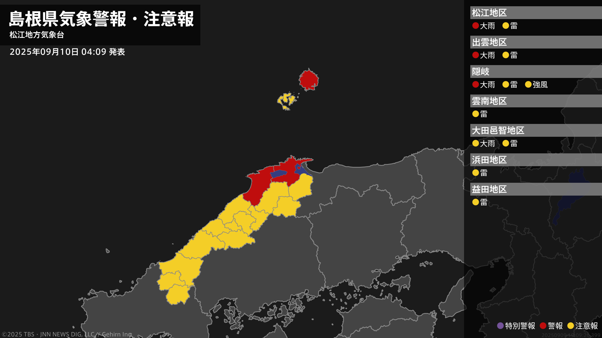 【大雨警報】島根県・隠岐の島町に発表 10日04:09時点
