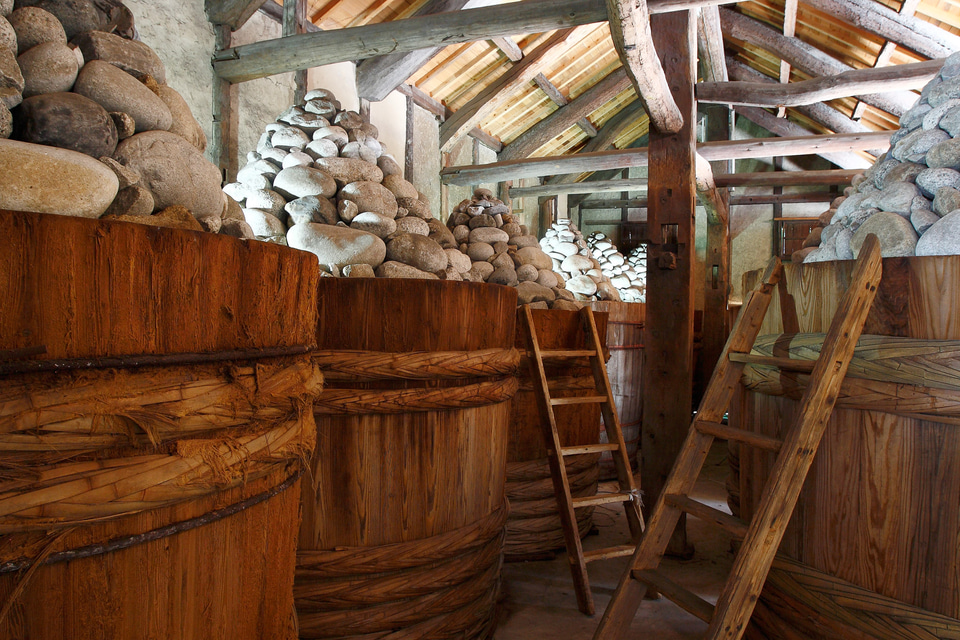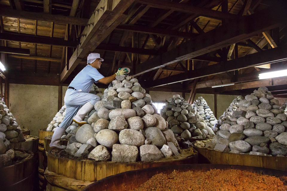 仕込みに使用する木桶は直径、高さとも約2m、重さは約700kg。桶のなかには、約6トンの味噌が入れられ、その上に3トンもの重石が円すい形に積み上げられて使用されます。