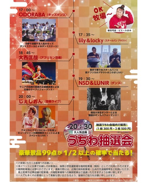 さらに、豪華景品99点が1/2以上の確率で当たる!うちわ抽選会にも注目だ。会場内で抽選うちわ(1枚300円・2枚500円)購入で、参加可能。抽選会は20:30~。