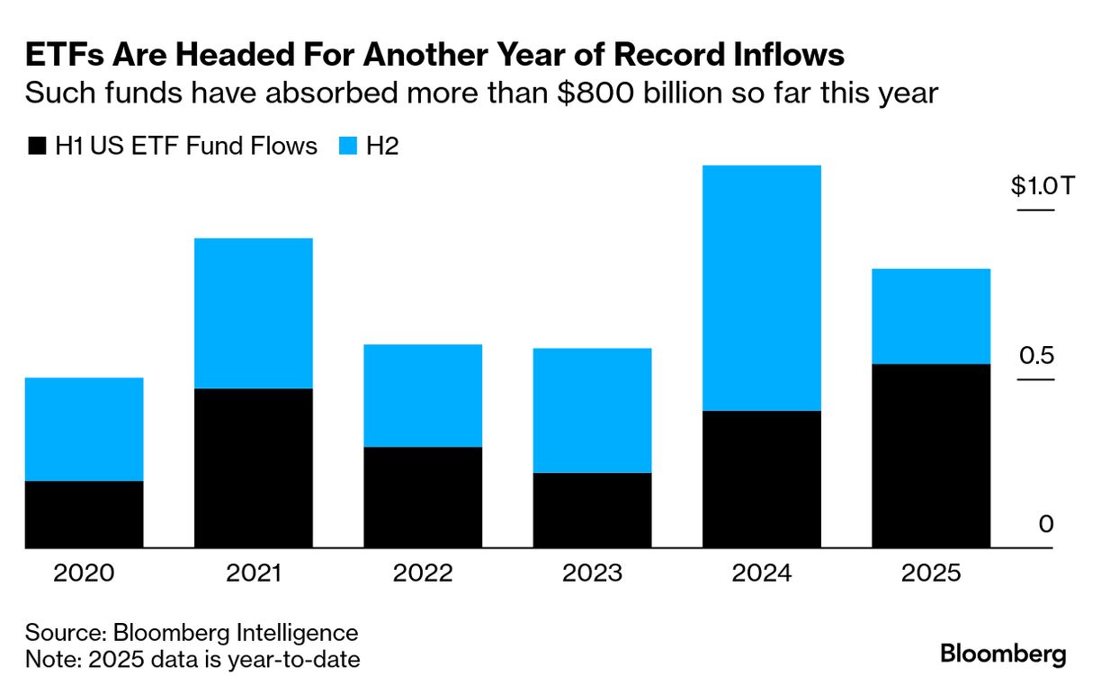 このうち株式向けが4750億ドルを占め、同時にミューチュアルファンドからは資金が流出。年間のETF流入額は1兆ドル超えの勢いで、過去最大となる見込みだ。