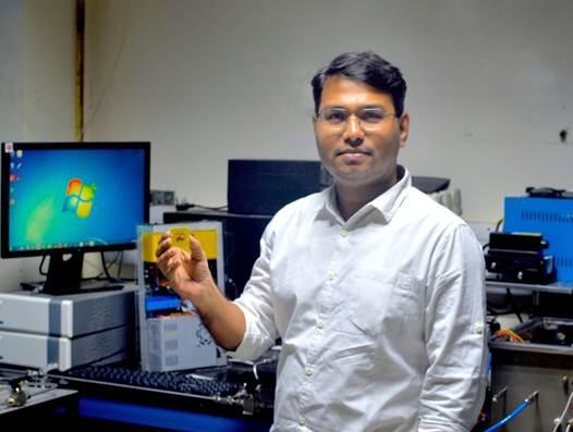 研究室で製作された小型センサーデバイスチップを持つIISER-TVM のヴィナヤック・B・カンブル(Vinayak B. Kamble)准教授