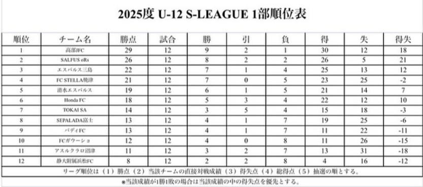 2024年度 静岡県U-12 Sリーグ 優勝はSALFUS oRs!S1&S2 最終順位掲載!