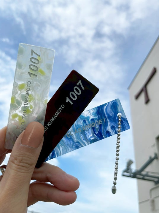 『HOTEL TAU, KUMAMOTO』だけのオリジナルルームキーホルダーは、製造過程で発生するアクリルの端材を再利用してつくった、地球に優しいアップサイクルなキーホルダーです。