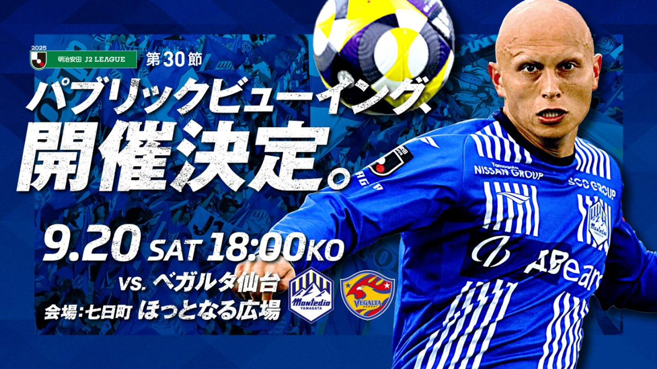 モンテディオ山形では、9月20日(土) 七日町ほっとなる広場(山形市)にて、2025明治安田J2リーグ第30節 アウェイ ベガルタ仙台戦のパブリックビューイング を開催いたします!
