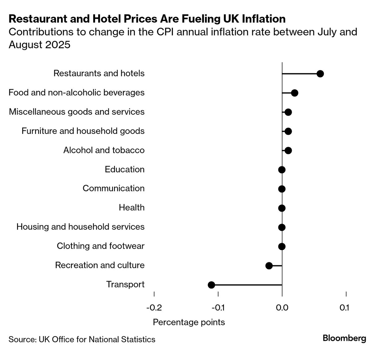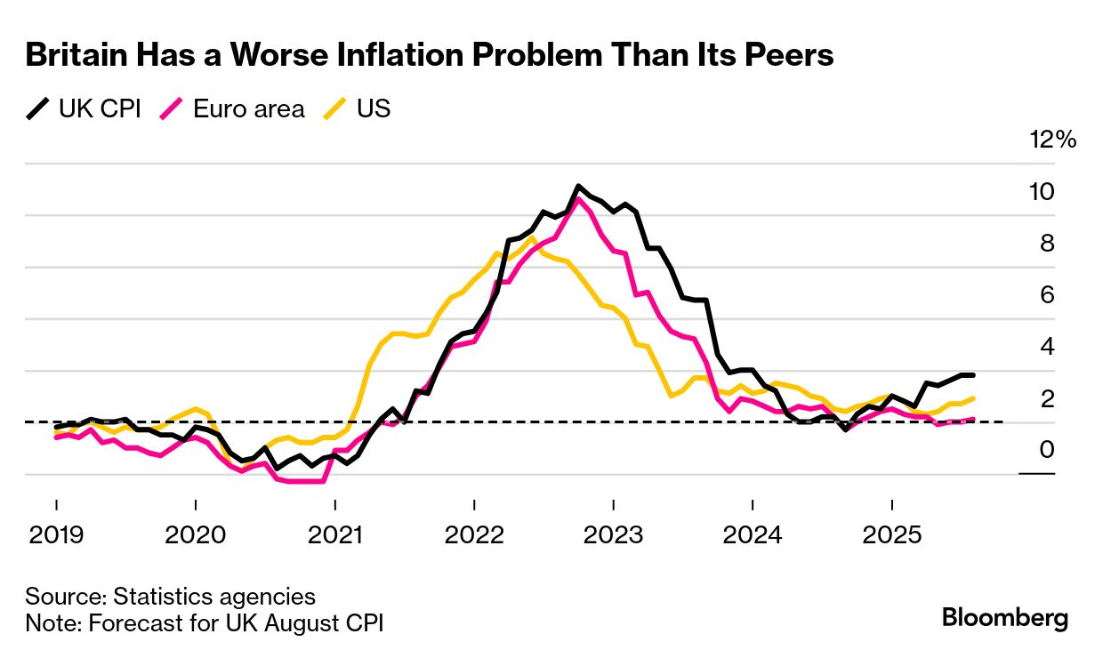 英国のインフレ率は8月も約1年半ぶりの高水準にとどまった。イングランド銀行(英中央銀行)が18日に開く金融政策委員会(MPC)で追加利下げに慎重な姿勢を崩さない公算が大きくなった。