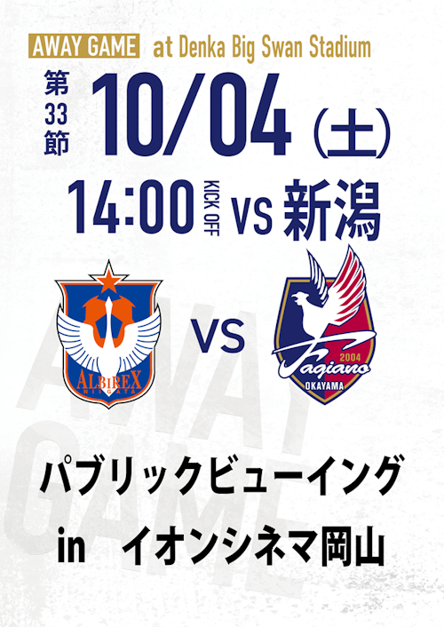 10月4日(土)にアウェイで行われる2025明治安田J1リーグ 第33節 アルビレックス新潟戦のパブリックビューイングを、イオンシネマ岡山にて開催することが決定いたしました!