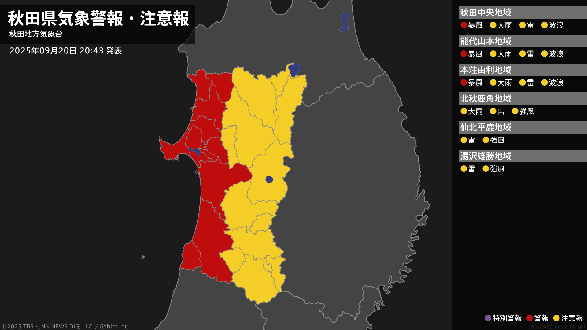 【暴風警報】秋田県・藤里町、五城目町、八郎潟町、井川町、大潟村に発表 20日20:43時点
