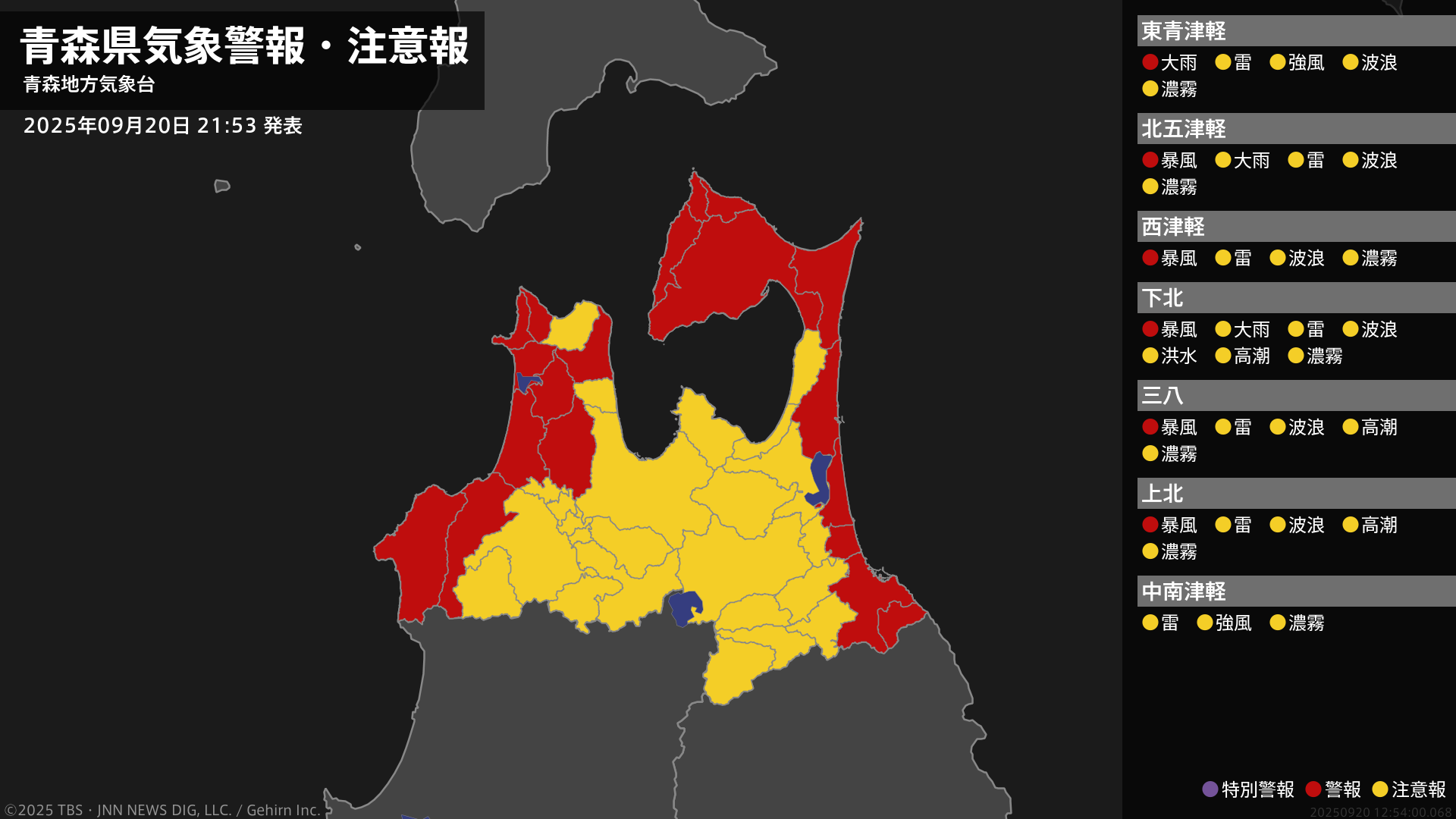 津軽では、21日明け方まで土砂災害に警戒してください。津軽の海上では20日夜遅くまで、下北、三八上北の海上では21日未明まで、暴風に警戒してください。