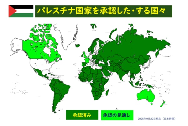 イスラエルによるパレスチナ自治区ガザへの攻撃に歯止めがかかりません。6万5000人のパレスチナ人が犠牲になりましたが、攻撃はエスカレートするばかりです。こうした中、フランス、英国などがパレスチナ国家の承認に踏み切ることになりました。イスラエルに圧力をかける狙いです。国連加盟193カ国のうち、実はすでに約150カ国がパレスチナ国家を承認済みです。認めていないのは米国や日本など少数の国にすぎません。国家承認の意味はどこにあるのか、日本はどうするのか、やさしく解説します。