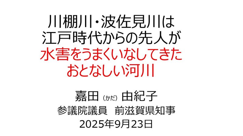 9月22日、長崎県に来ています。明日、23日は石木ダム問題の公開討論会です。基本講演を元国土交通省技術者の宮本博司さん、その講演を受けて私がコメント。今、長崎県が、13世帯50人の住民を追い出して、ダムの本体工事にかかろうとしています。これまで日本に前例のない、家や農地を強制収容して、必要性が科学的に証明されないダムをつくろうとしています。直接責任者は長崎県知事、後ろには事業認可をした国土交通省があります。15分の限られたレクチャー、昨日の琵琶湖博物館の川を守り続けてきた江戸時代からの住民の思いと貢献、その背景も紹介し、長崎県知事に、50人の住民の命の未来!を握る責任の大きさを、知事経験者として強くうったえます。パワポ、12枚、紹介します。