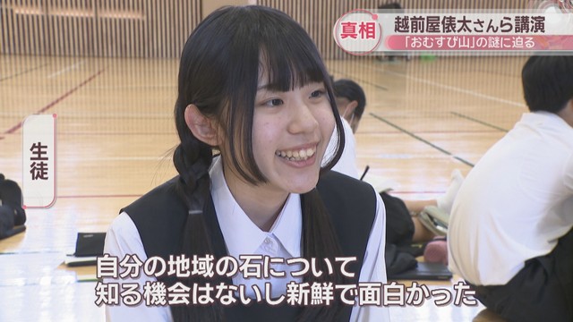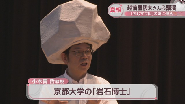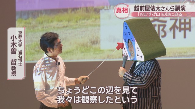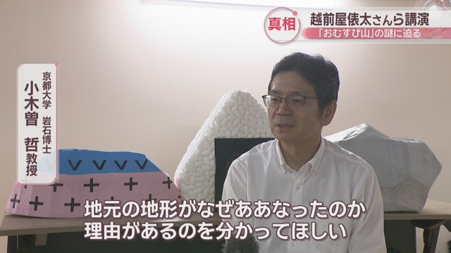 京都大学の「岩石博士」こと、小木曽哲教授です。3人はおむすび山に登って撮影した映像を生徒に見せながら真相に迫りました。