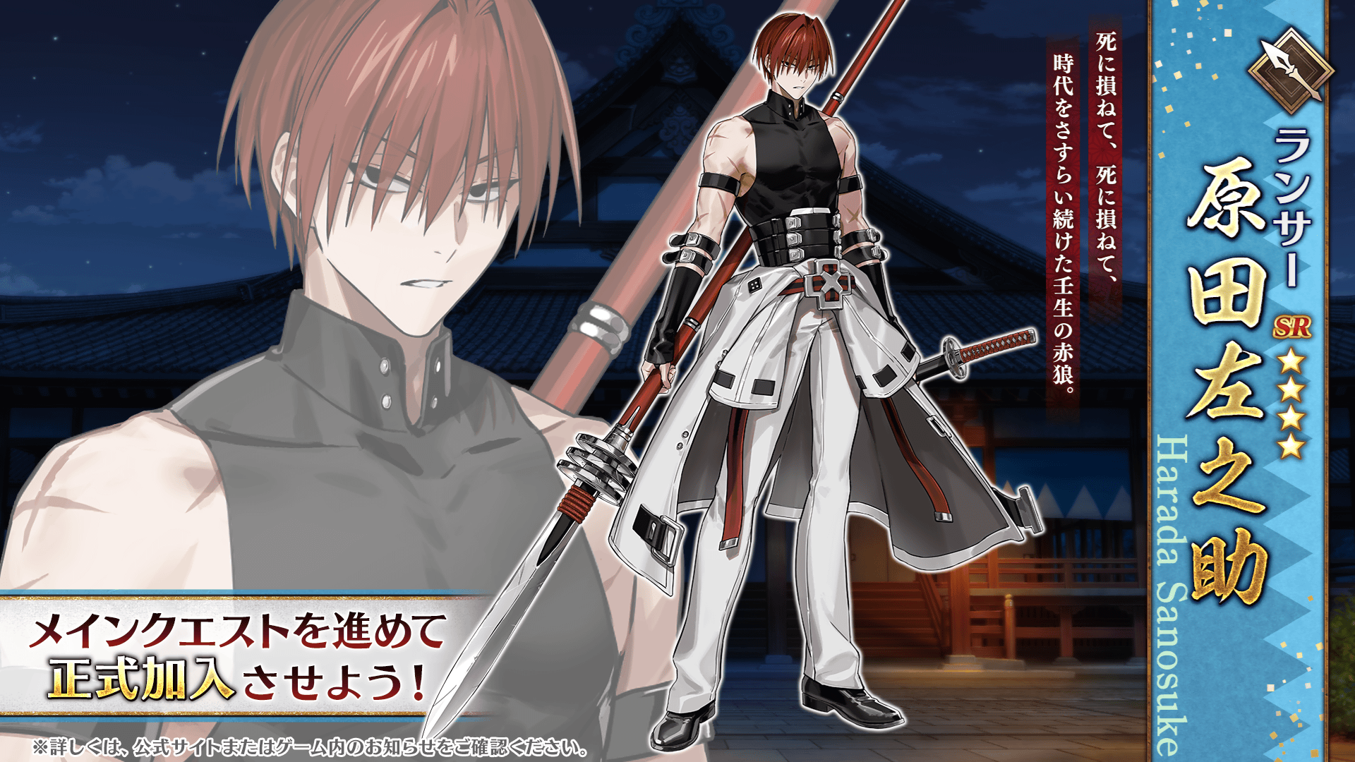 期間限定イベント「幕末チャンバラ神話 ぐだぐだ新選組・ジ・エンド REVENGE OF MAKOTO」のメインクエストを進めることで、イベント限定の配布サーヴァント「★4(SR)原田左之助」を正式加入させることができます。