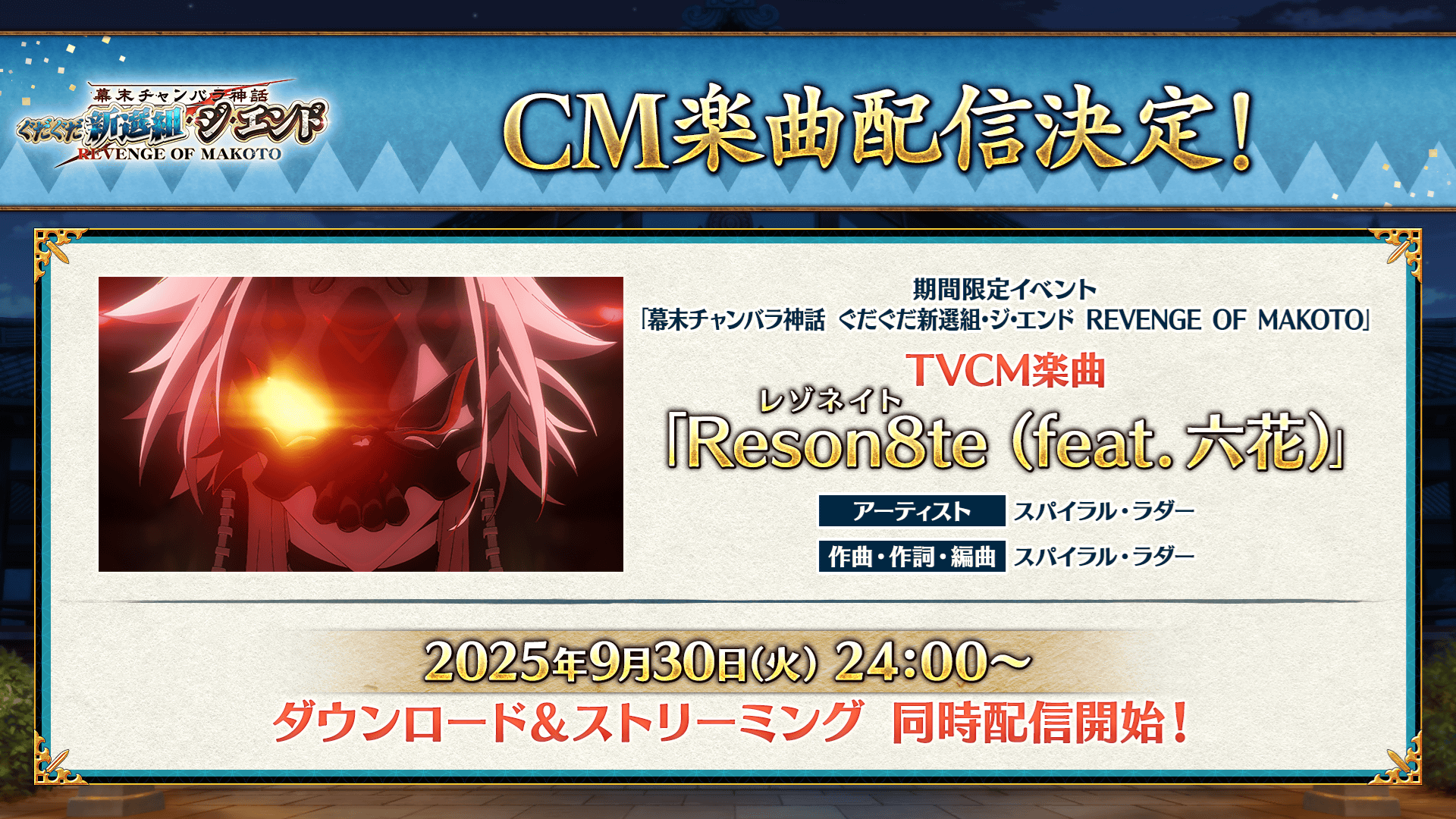 ◆期間限定イベント「幕末チャンバラ神話 ぐだぐだ新選組・ジ・エンド REVENGE OF MAKOTO」TVCM楽曲の配信が決定!◆