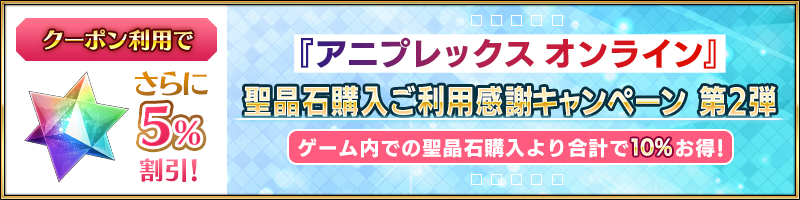 9月24日(水)より期間限定で『アニプレックス オンライン』にて聖晶石を購入する際に、クーポン利用条件を達成し、クーポンコードを入力すると「さらに5%OFF(通常の5%OFFとあわせて合計10%OFF)」にて聖晶石を購入いただけるキャンペーンを実施いたします。