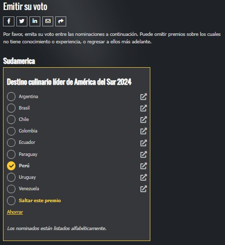 南米セクションに移動し、お気に入りのカテゴリを選択してペルーに投票してください.