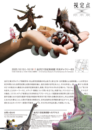 金沢工業大学メディア情報学科 村山 祐子教授の研究室では、村山教授と大学院工学研究科 システム設計工学専攻博士前期課程2年の吉村 聖隆さんとの二人による「師弟展」を、2025年10月15日(水)から10月19日(日)まで、金沢21世紀美術館 市民ギャラリーB3で開催します。入場無料です。