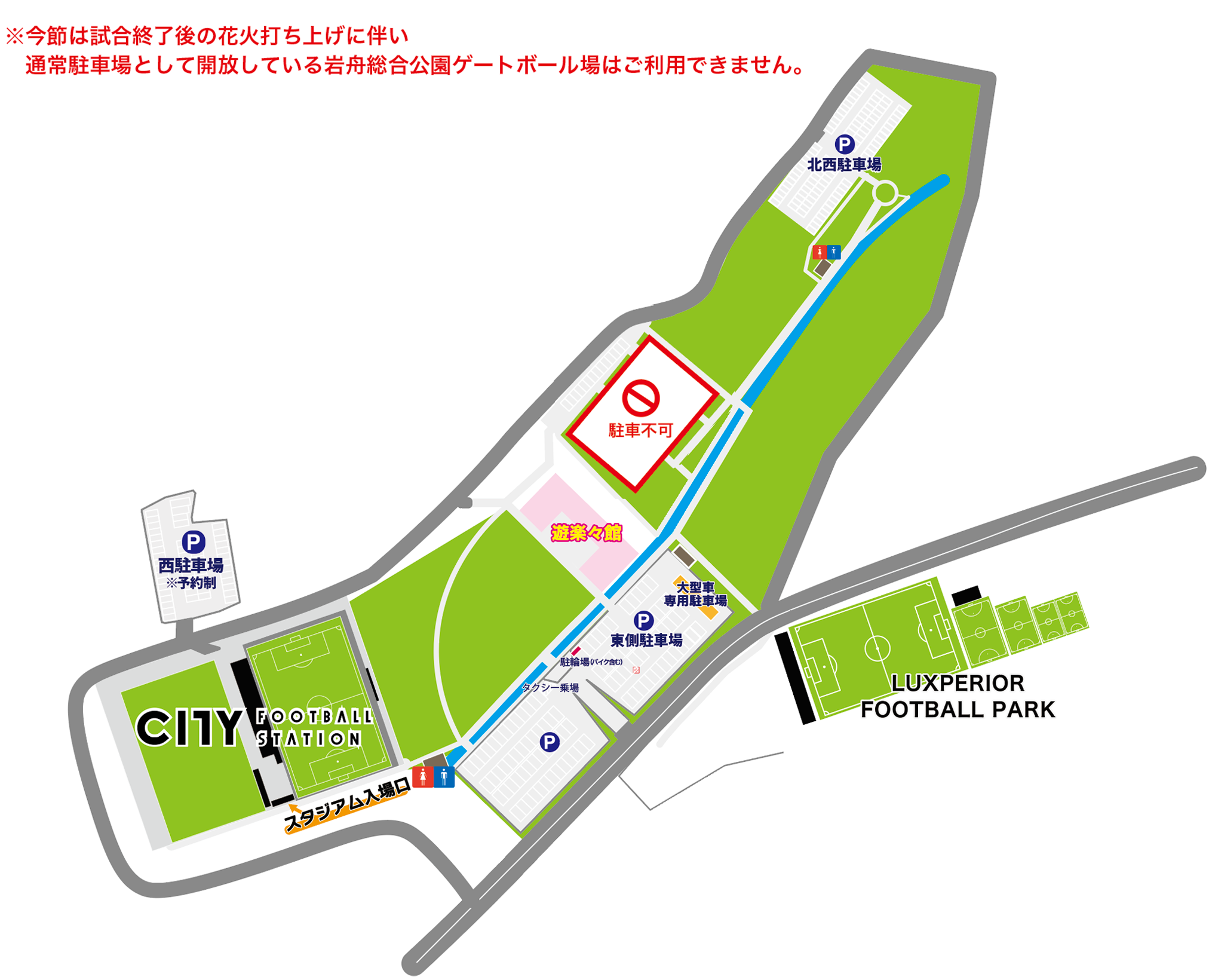 ※LUXPERIOR FOOTBALL PARK駐車場から遊楽々館の駐車場まで車道を歩いての通行は大変危険ですので、上記の地図の道を通りCFSの方へお越しください。