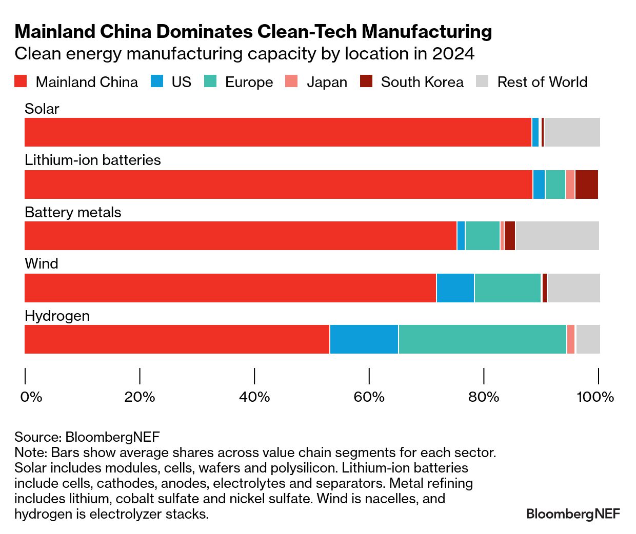 中国は世界の太陽光パネルの約80%、風力タービンの約60%、電気自動車(EV)の70%、電池の75%を生産。欧米よりも低コストで供給している。世界のクリーンエネルギー関連特許の約75%を占め、重要鉱物のサプライチェーンでも支配的地位を築いている。