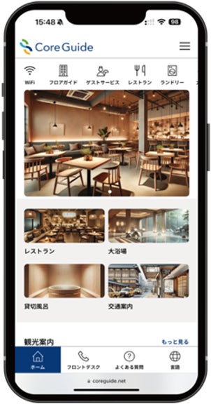 スマホ館内館外案内「Core Guide」スマホ館内館外案内「Core Guide」は宿泊者様がスマートフォンで館内案内やWi-Fi情報、チェックアウト時間を確認できるサービスです。QRコードを読み込むだけで利用可能。