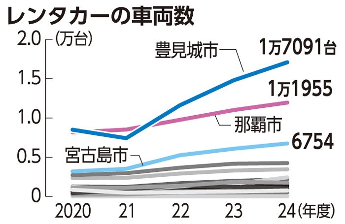 沖縄ではレンタカーが観光客の移動手段の主流。那覇空港に近い豊見城市のレンタカー事業者数は24年度時点で217あり、20年度の72から3倍に増えた。車両数も8506台から1万7091台と倍になり、離島を含む沖縄全体(5万6658台)の3割が同市に集中する。24年度の事業者数は那覇市、宮古島市に次いで3番目、車両数は最多だ。