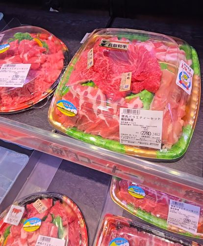 精肉売り場には、主に鳥取県産の牛肉・豚肉・鶏肉など、地元の恵みがずらりと並びます。
