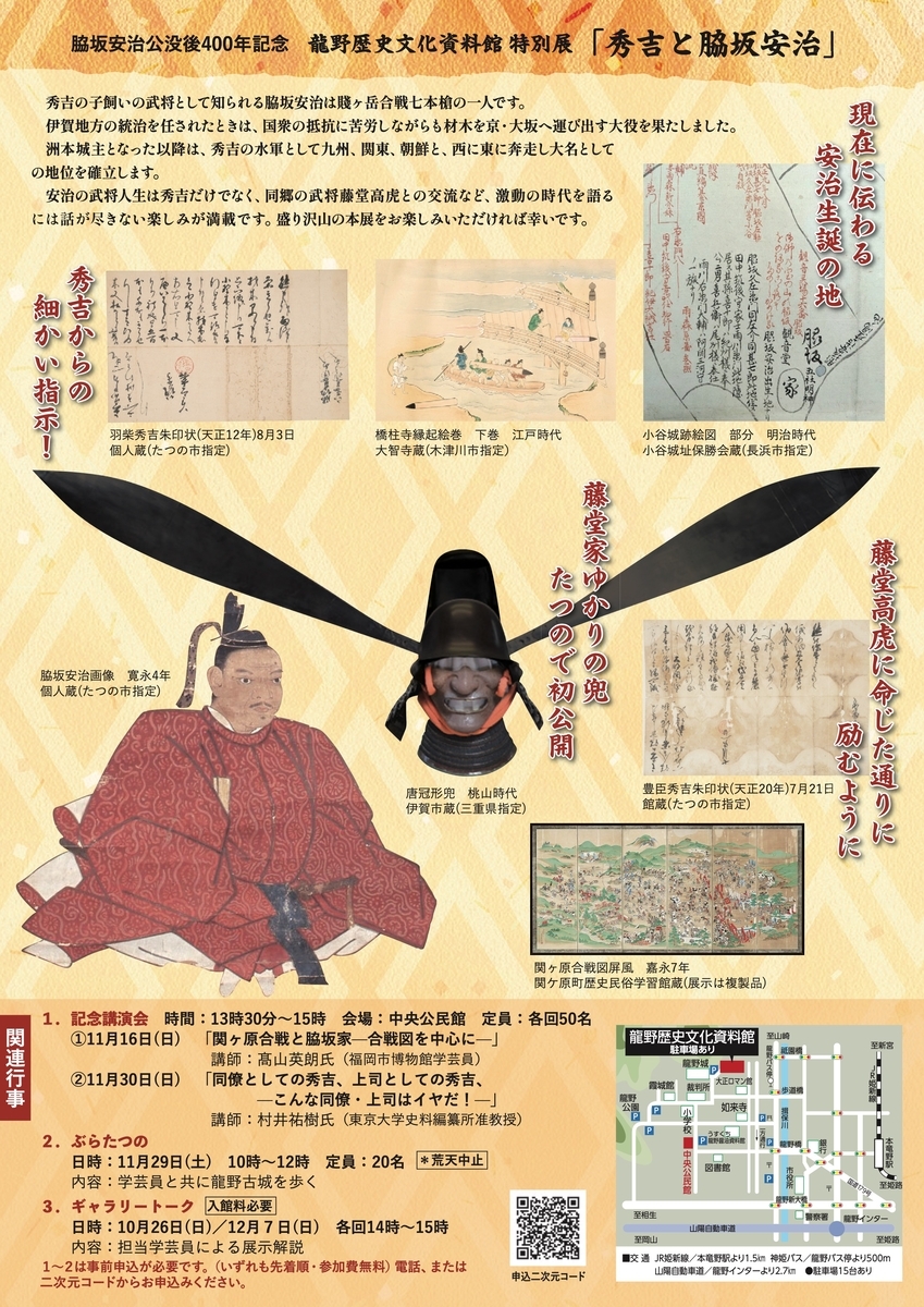 10月25日(土)から12月7日(日)までの間、龍野歴史文化資料館(兵庫県たつの市)において脇坂安治公没後400年記念特別展「秀吉と脇坂安治」が開催されます。一般400円。