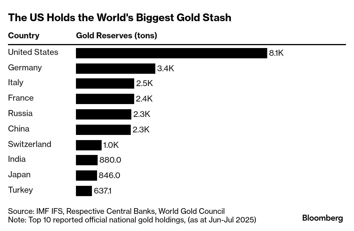 米国の金準備は世界最大の保有量で、年初から45%の上昇を経て、29日に金価格が1オンス=3824.50ドルを超えたことで節目を突破した。ただし、公式評価額は1973年に議会が定めた1オンス=42.22ドルを基準としており、110億ドル余りにとどまる。