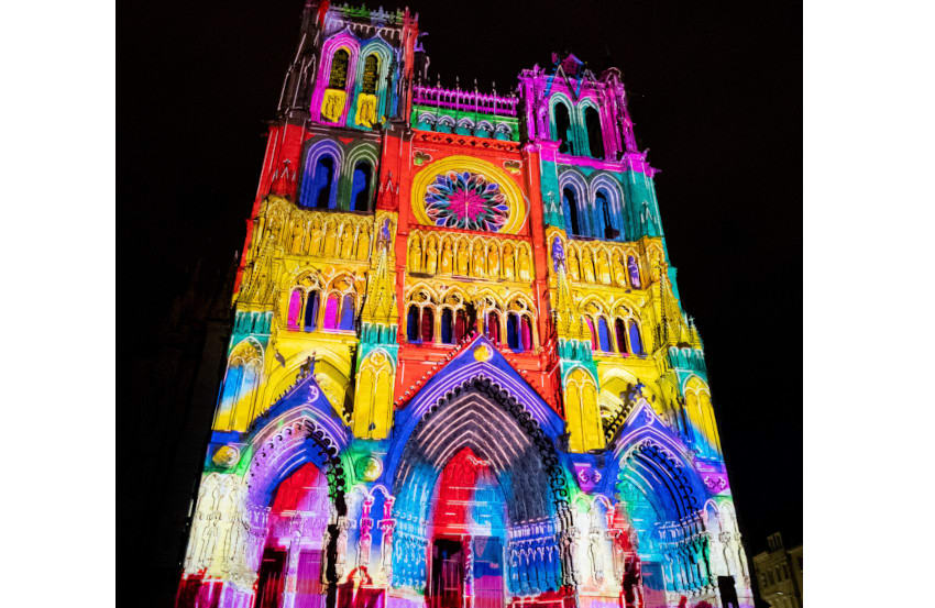 アミアンの精華であり、フランスを代表するゴシック建築のひとつでもあるノートルダム大聖堂(Cathédrale de Notre-Dame)。全長145メートル、身廊のアーチの長さは42メートルと圧巻の大きさ。写真は、毎年夏に開催されるプロジェクトマッピングの時のもの。© Teddy Henin