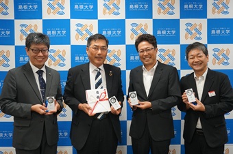 寄贈品の贈呈は,協和地建コンサルタント株式会社,株式会社山陰合同銀行によるもので,協和地建コンサルタント株式会社代表取締役社長 石倉 昭和様,株式会社山陰合同銀行松江法人営業部担当部長 金築 司様から大谷 浩学長へ目録が手渡されました。