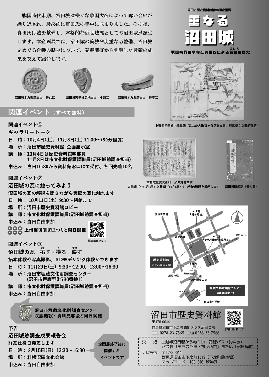 10月4日(土)から12月7日(日)までの間、沼田市歴史資料館(群馬県沼田市)において第28回企画展「重なる沼田城 戦国時代の争奪と真田氏による普請(ふしん)の歴史」が開催されます。一般220円。