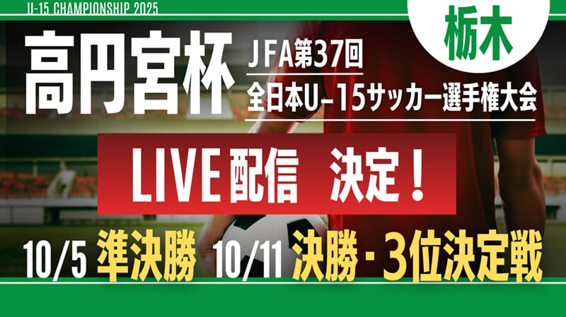 2025年度 第1回 栃木県サッカー協会会長杯(U-15)サッカー選手権大会 兼 第37回 高円宮杯全日本ユース(U-15)サッカー選手権の準決勝、決勝、3位決定戦の4試合を株式会社グリーンカードがLIVE配信します。