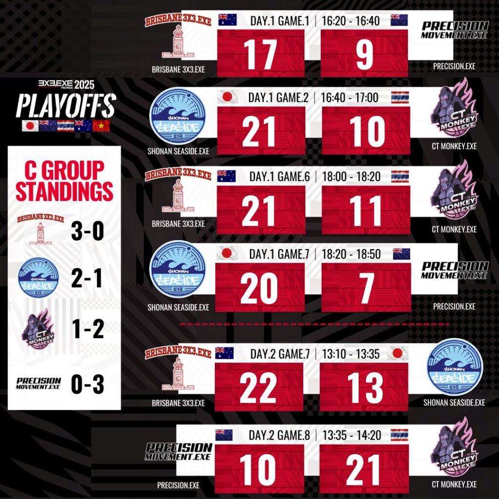 昨年BRISBANE CITY BLUE.EXEで出場したメンバーがそのままBRISBANE 3X3.EXEへ移籍し構成されたチーム。昨年はPLAYOFFSでBEST4。3×3.EXE SUPER PREMIERにも出場したが結果を出すことはできなかった。リベンジを果たすべく挑んできた彼らは、そもそも個々の能力が高いことに加え、3×3を同じメンバーで2年経験してきたことから、連携も著しく向上した完成度の高いチームとして戻ってきた。MVPのカイを中心としたゲームメイクで外からも中からも得点を重ね、見事リベンジ達成。オーストラリア初優勝を飾った。