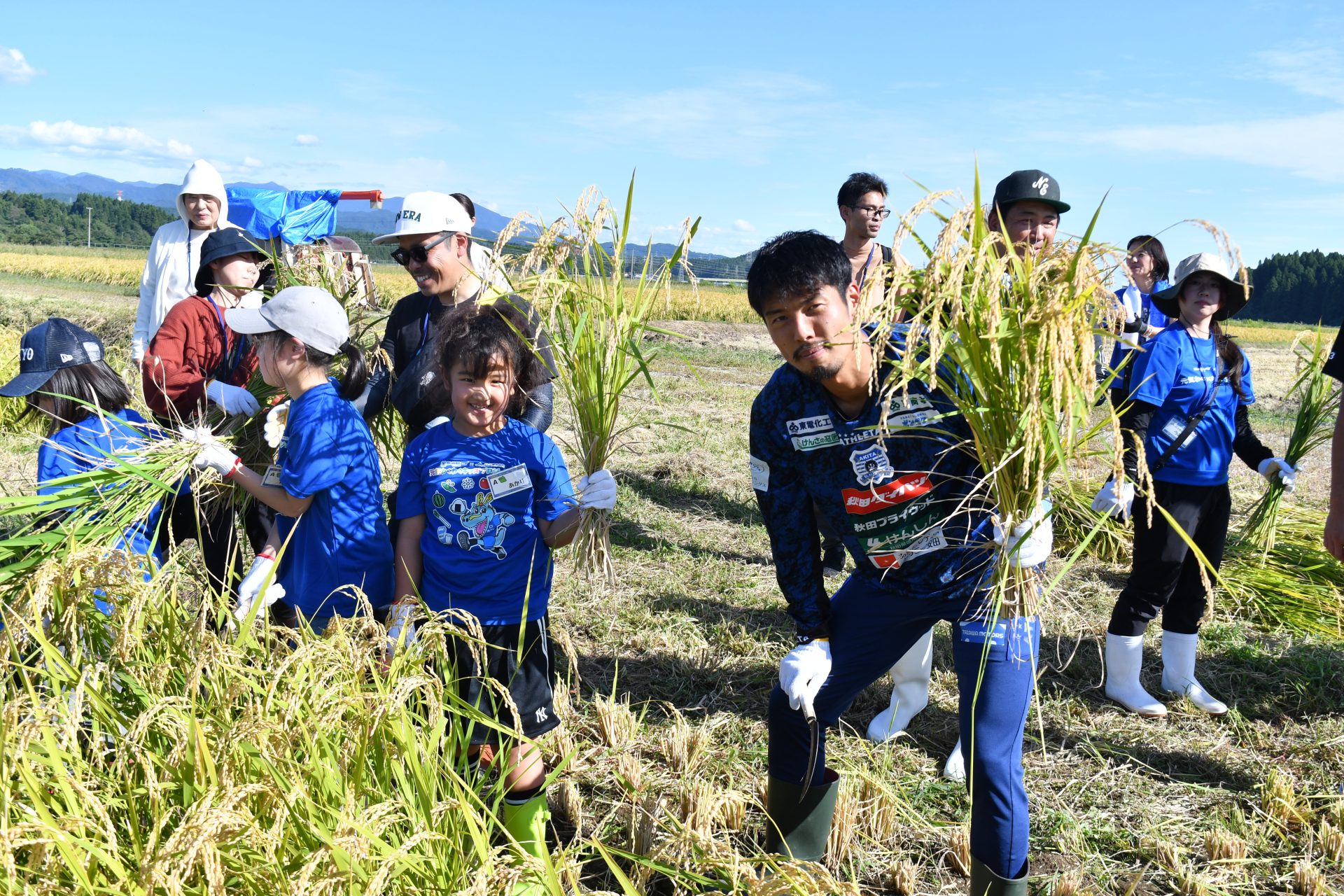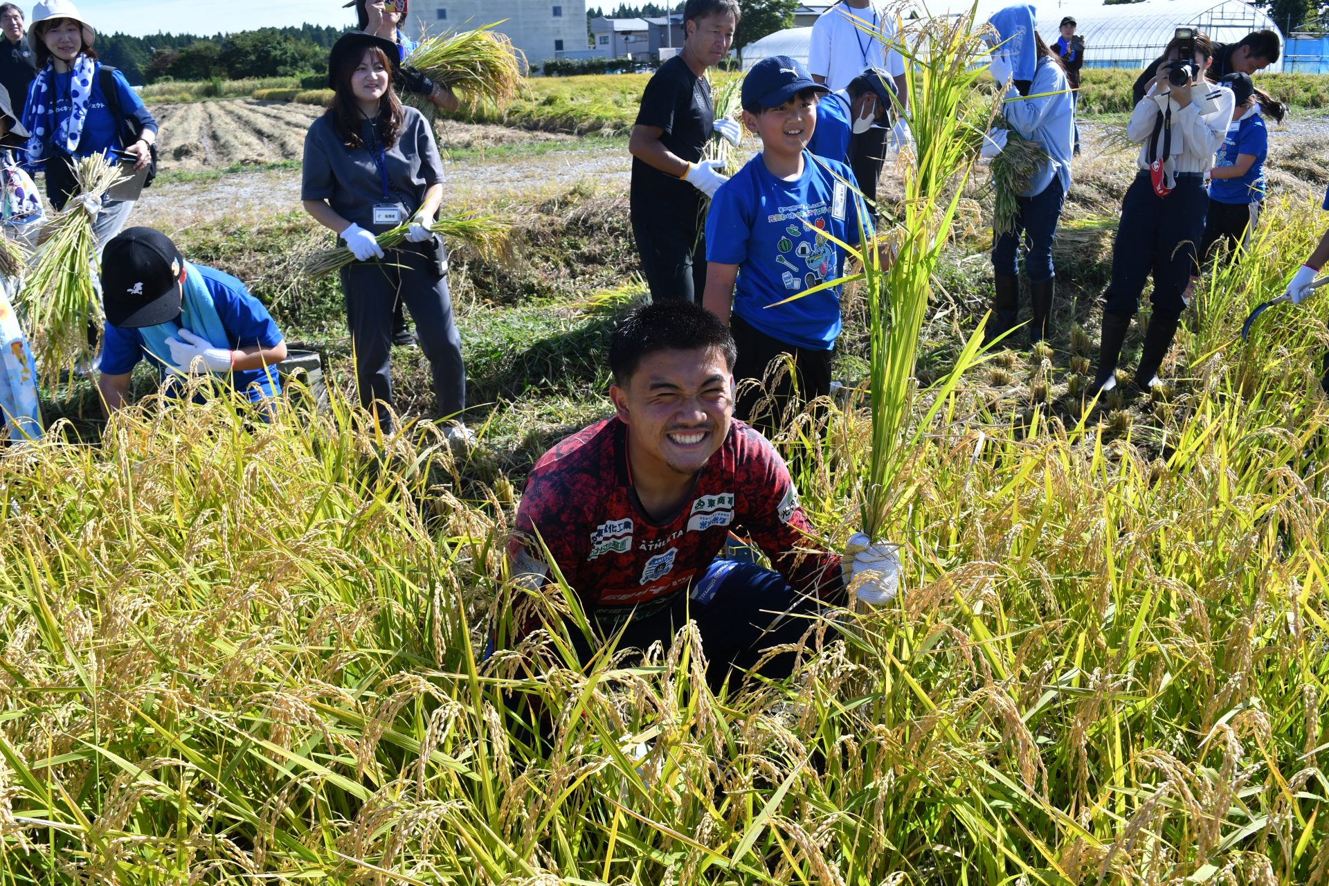 稲刈りにはDF2 岡﨑亮平選手、GK47 堀内智葵選手、ブラウゴンが参加し、鎌を使用して「あきたこまちR」の稲を自分たちの手で刈り取りました。