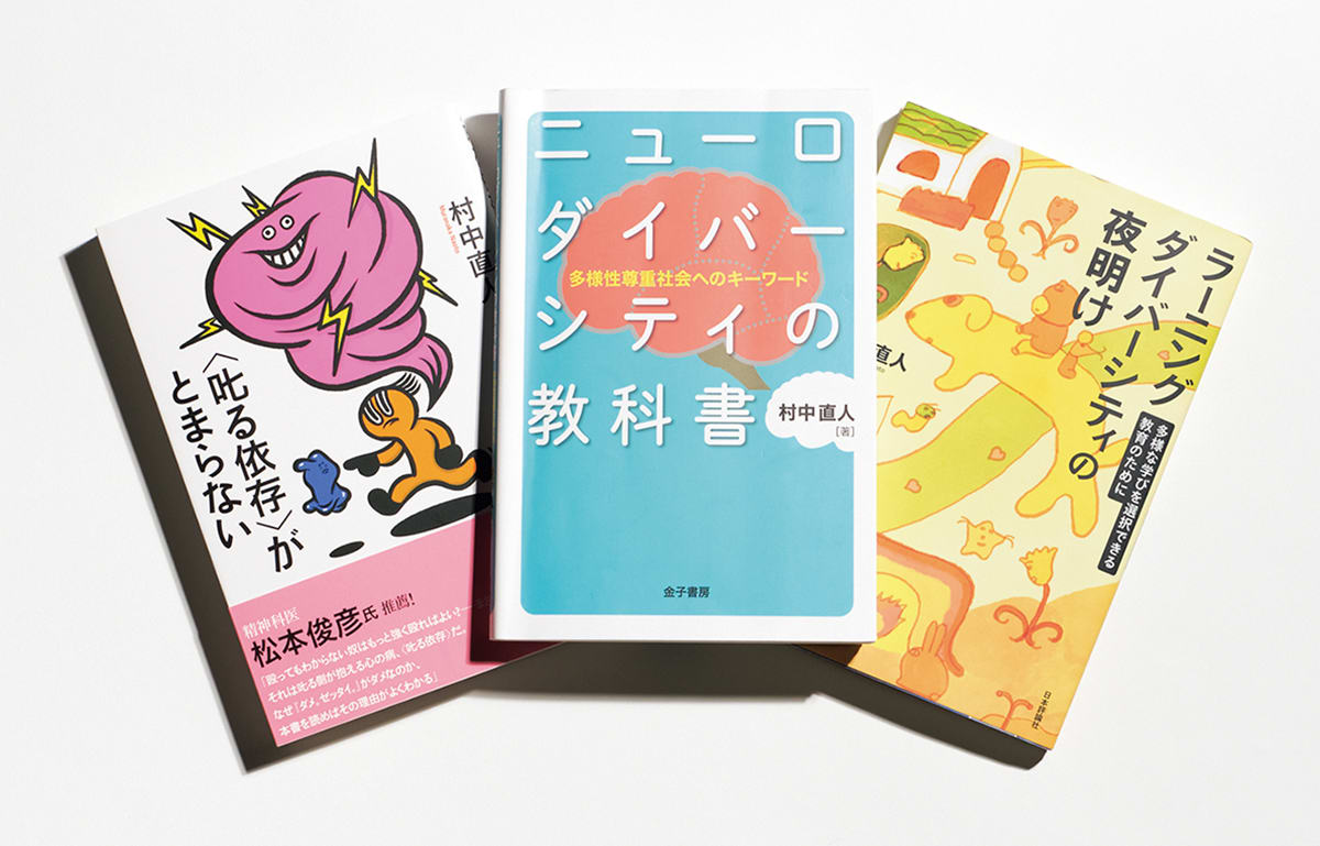 村中さんの代表的な著書。『〈叱る依存〉がとまらない』(紀伊國屋書店)、『ニューロダイバーシティの教科書 多様性尊重社会へのキーワード』(金子書房)、『ラーニングダイバーシティの夜明け 多様な学びを選択できる教育のために』(日本評論社)。