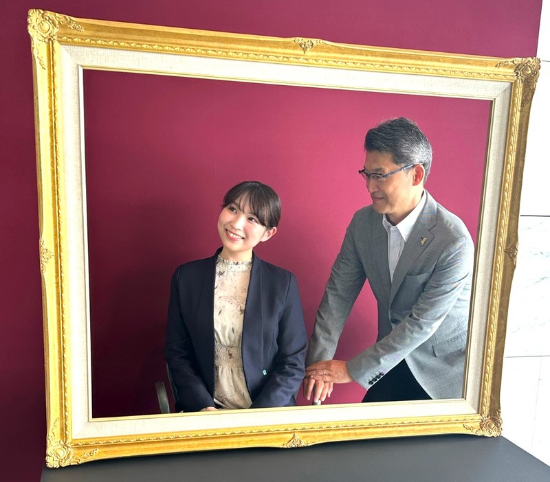 会場ロビーには、絵画の人物になりきって写真を撮ることができる額縁が用意されています。開会式の司会を務めていただいたUMKの佐々木紅音アナウンサーと撮影。<自由気ままな娘を思いやる父>という感じでしょうか?