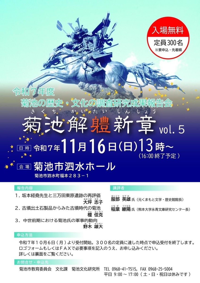 11月16日(日)、菊池市泗水ホール(熊本県菊池市)において「菊池の歴史・文化の調査研究成果報告会 菊池解軆新章vol.5」が開催されます。参加無料、要事前申込。