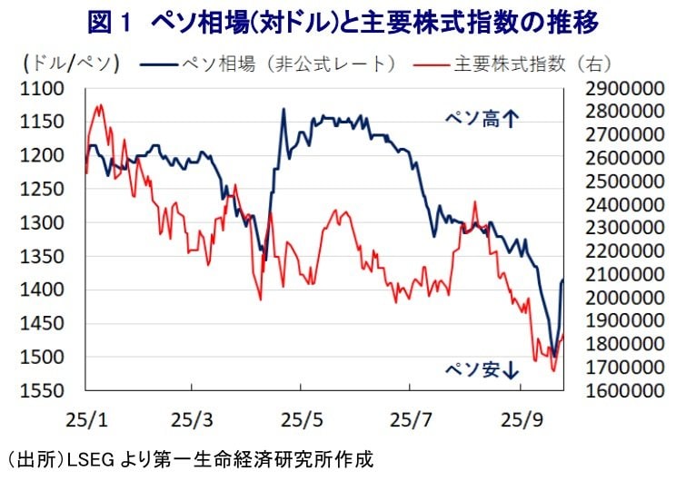 その結果、通貨ペソの対ドル相場や主要株式指数(メルバル指数)はともに調整の動きを強めるなど、資金流出圧力が強まる事態に直面した。