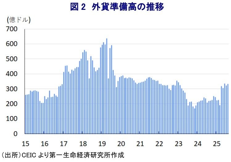 こうしたなか、会談後にトランプ氏はミレイ氏を全面的に支持する方針を示すとともに、ベッセント米財務長官も2,195億ドルの為替安定化基金を活用した同国のペソ建て及びドル建国債の購入や信用供与枠提供のほか、通貨スワップ協定の導入などを検討している旨を明らかにした。