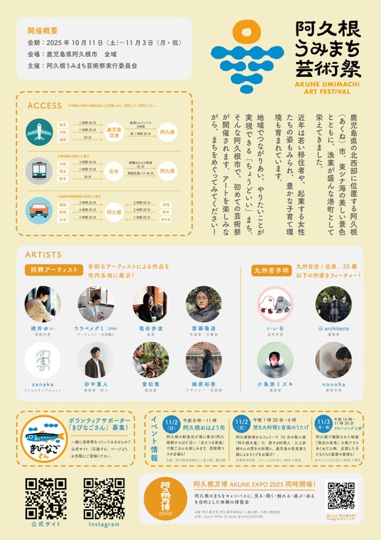 参加アーティストや鑑賞チケットの購入方法などの詳しい情報は、阿久根うみまち芸術祭公式サイトをご確認ください。
