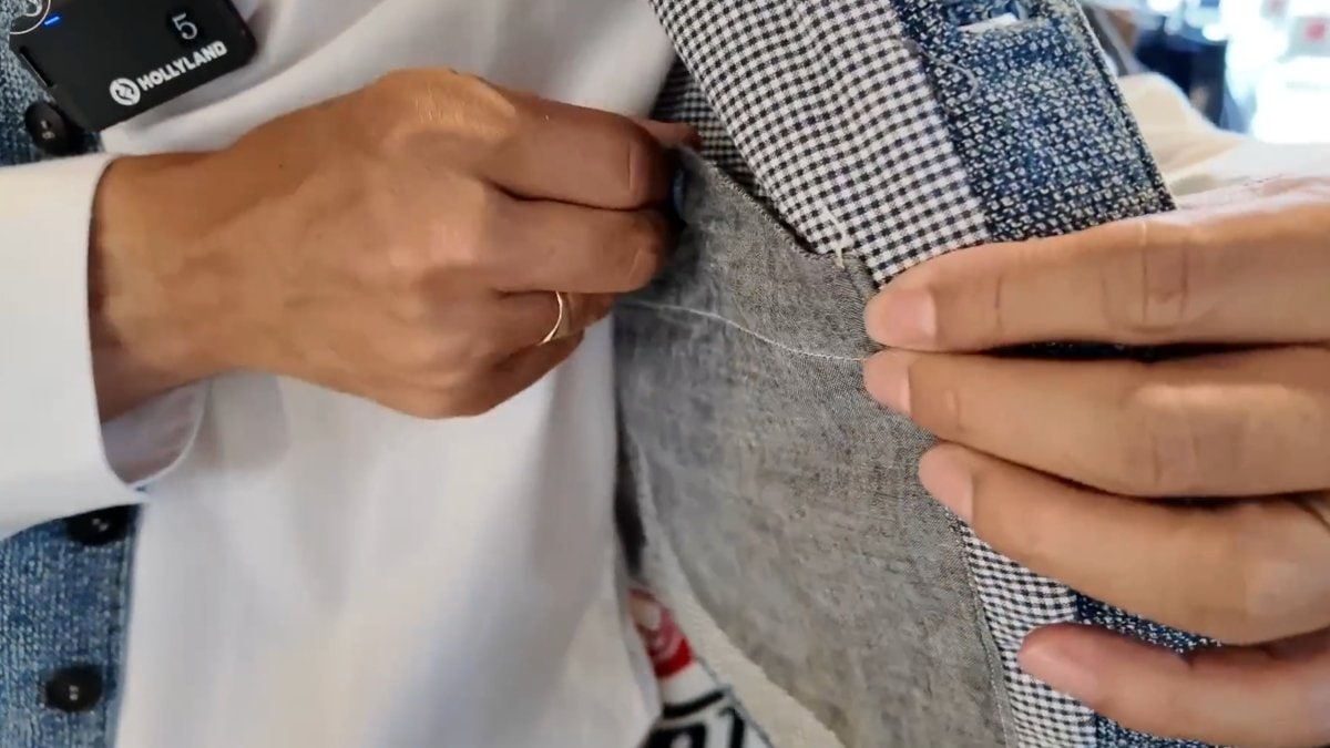 ハンドステッチ仕立てで、内側にはベタシャンのポケットも。(ベタシャンとは、通常白糸と染め糸を使って織り上げるシャンブレー生地を、染め糸のみで織り上げたもの。)