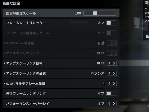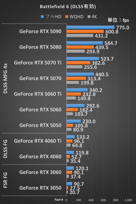 RTX 50シリーズはDLSS 4に対応しているためマルチフレーム生成4xに設定、RTX 40シリーズはDLSS 3のフレーム生成を利用、RTX 30シリーズはDLSSのフレーム生成はサポートしていないのでFSRのフレーム生成を利用した。Battlefield 6は、アップスケーラをDLSS、フレーム生成をFSRなどそれぞれを別技術に設定できるようになっている。
