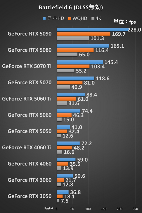 このテストはDLSSなどに頼らない素の性能と言え、RTX 5060とRTX 4060 Tiが同等などそれぞれの力関係が見えてくるのもおもしろいところだ。