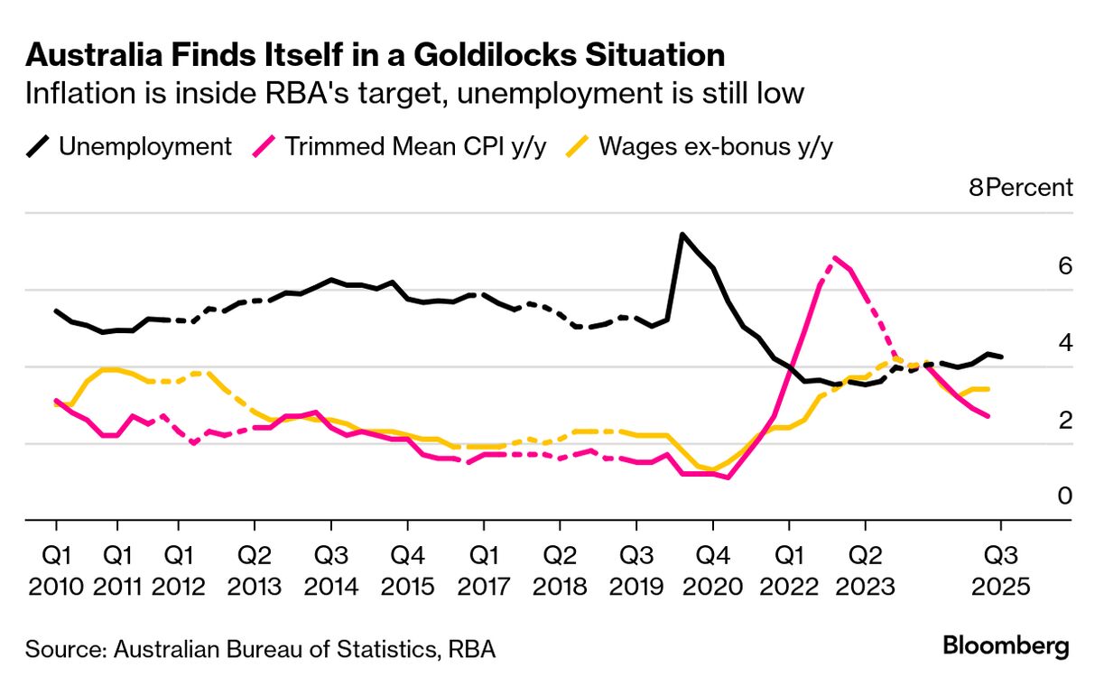 豪中銀は2月以降、3回利下げした後、9月の金融政策決定会合で政策金利を3.6%に据え置いた。インフレ率が目標レンジの中間値に向かっていることの裏付けを確認しようとしている。実質所得の伸びに伴う個人消費の予想以上の上振れ、住宅市場の再活性化、労働市場の堅調さも、現行金利を維持する要因となる。