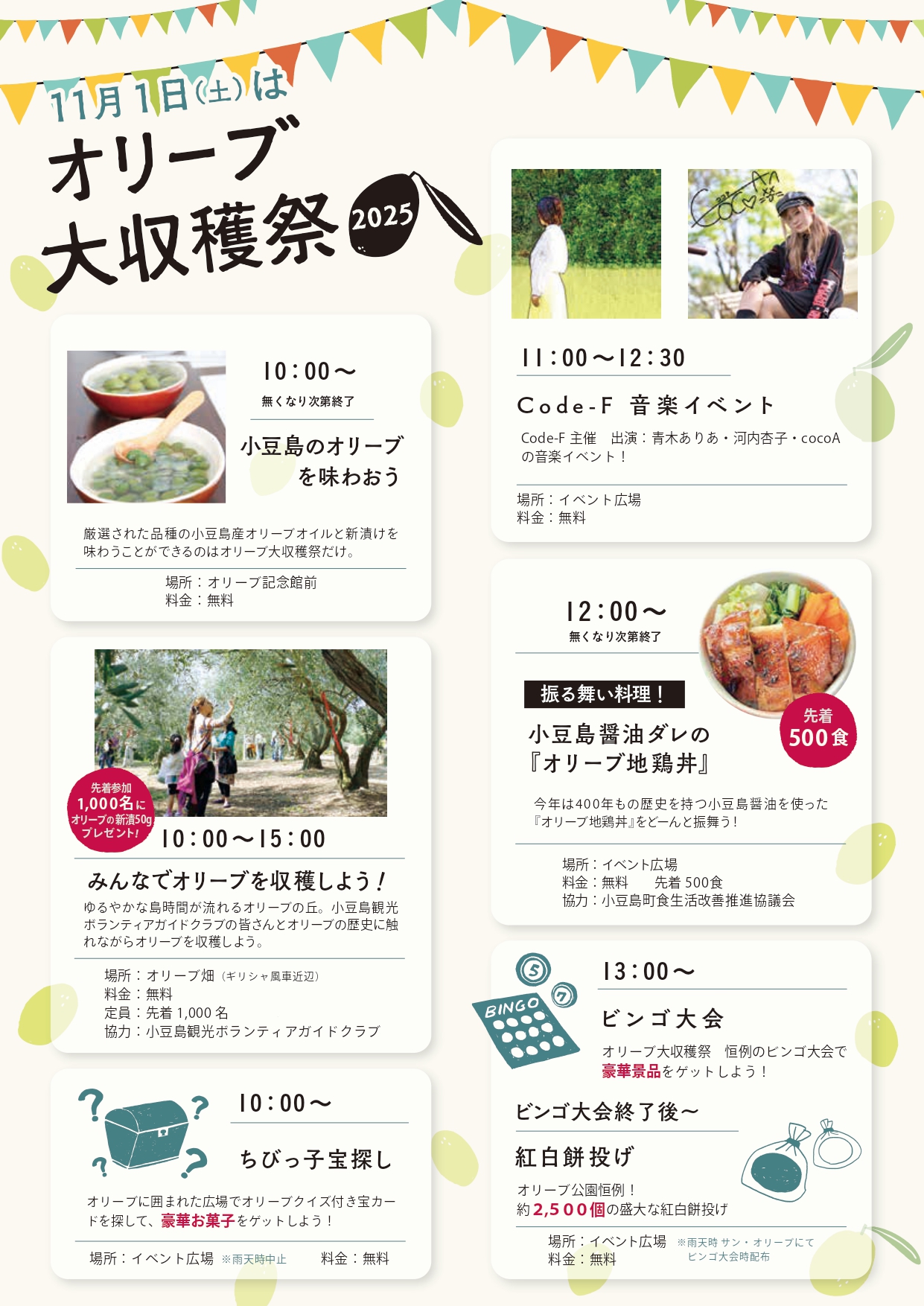 11月1日(土)10時〜は35回目となる大収穫祭が開催され、オリーブ記念館前では多種多様なオリーブの新漬けの味見ができるほか、15時まで先着1000名で、小豆島ボランティアガイドの説明とともに収穫体験ができる。音楽や子ども向けのイベントもあり、13時からのビンゴ大会終了後には、恒例となった収穫を祝う餅投げも開催される。